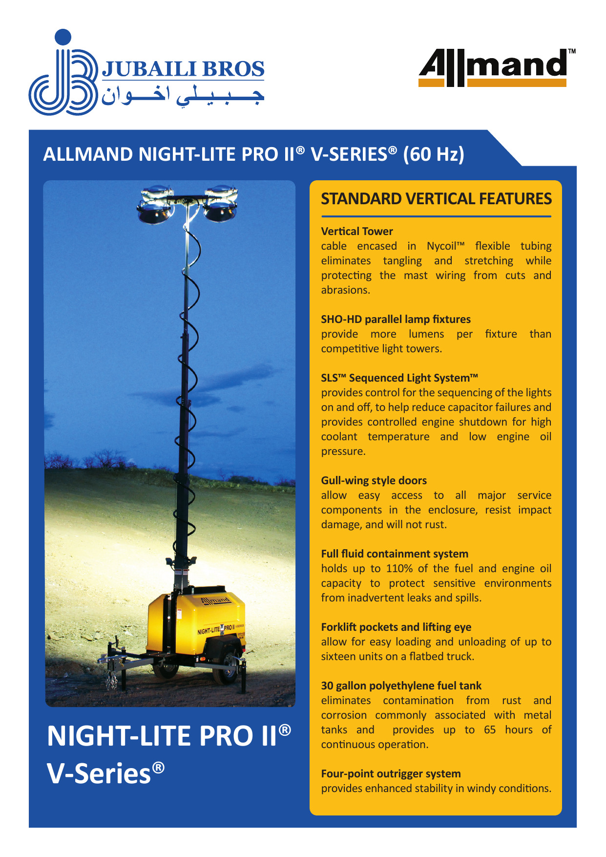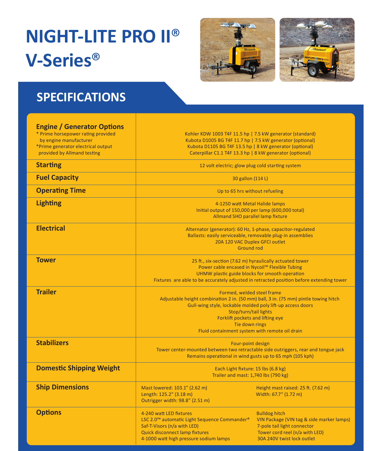 La serie V Allmand’s Night-Lite Pro II ofrece cuatro modelos de motor diferentes para satisfacer sus necesidades en el lugar de trabajo. La serie V presenta una torre vertical con cable de alimentación encerrado en un tubo flexible Nycoil ™ para eliminar enredos y estiramientos, mientras protege el cableado de la torre. Las lámparas SHO-HD proporcionan 135,500 lúmenes por lámpara, más que las torres de iluminación de la competencia. Con un tanque de combustible de polietileno de 30 galones y un sistema de contención de fluido completo que contiene hasta el 110% de todos los fluidos a bordo para proteger los entornos sensibles de fugas y derrames involuntarios. Esta torre de luz confiable maximizará su lugar de trabajo y la mantendrá en funcionamiento durante toda la noche.