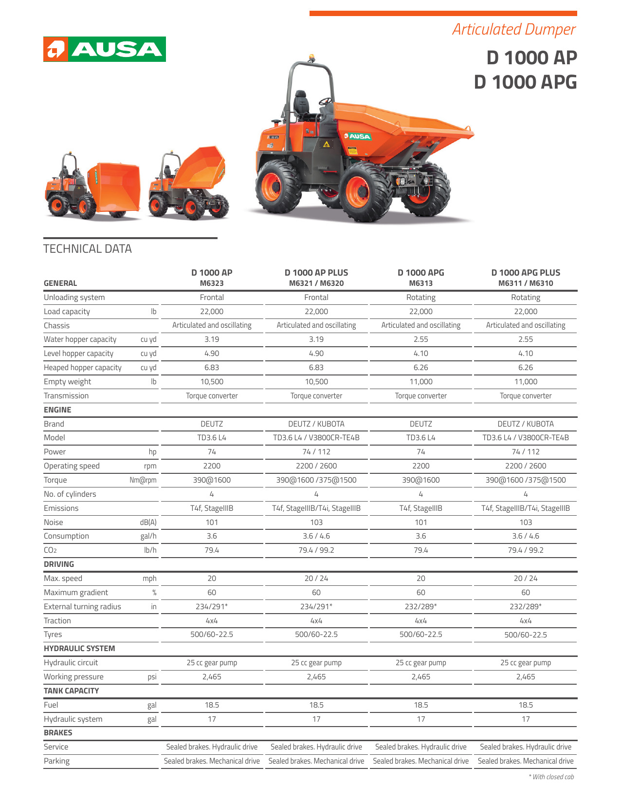 Con una carga útil de 10 toneladas (22,000 lbs), es el dúmper articulado de AUSA con la carga útil más alta y el único del mercado con esta carga útil que está equipada con un salto de punta oscilante, lo que lo hace muy versátil.