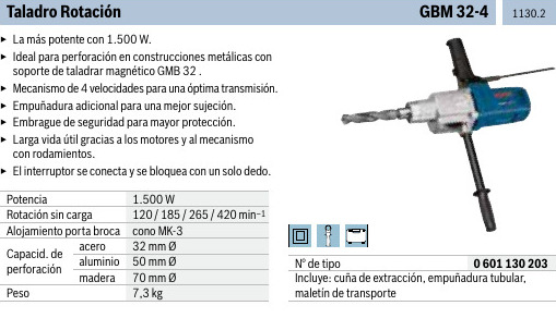 La taladradora más potente de Bosch con 1.500 Watts, para diámetros de perforación de hasta 32 mm y aplicaciones difíciles en acero. Ideal para perforación en construcciones metálicas con soporte de taladrar magnético GMB 32 Professional. Mecanismo de 4 velocidades.