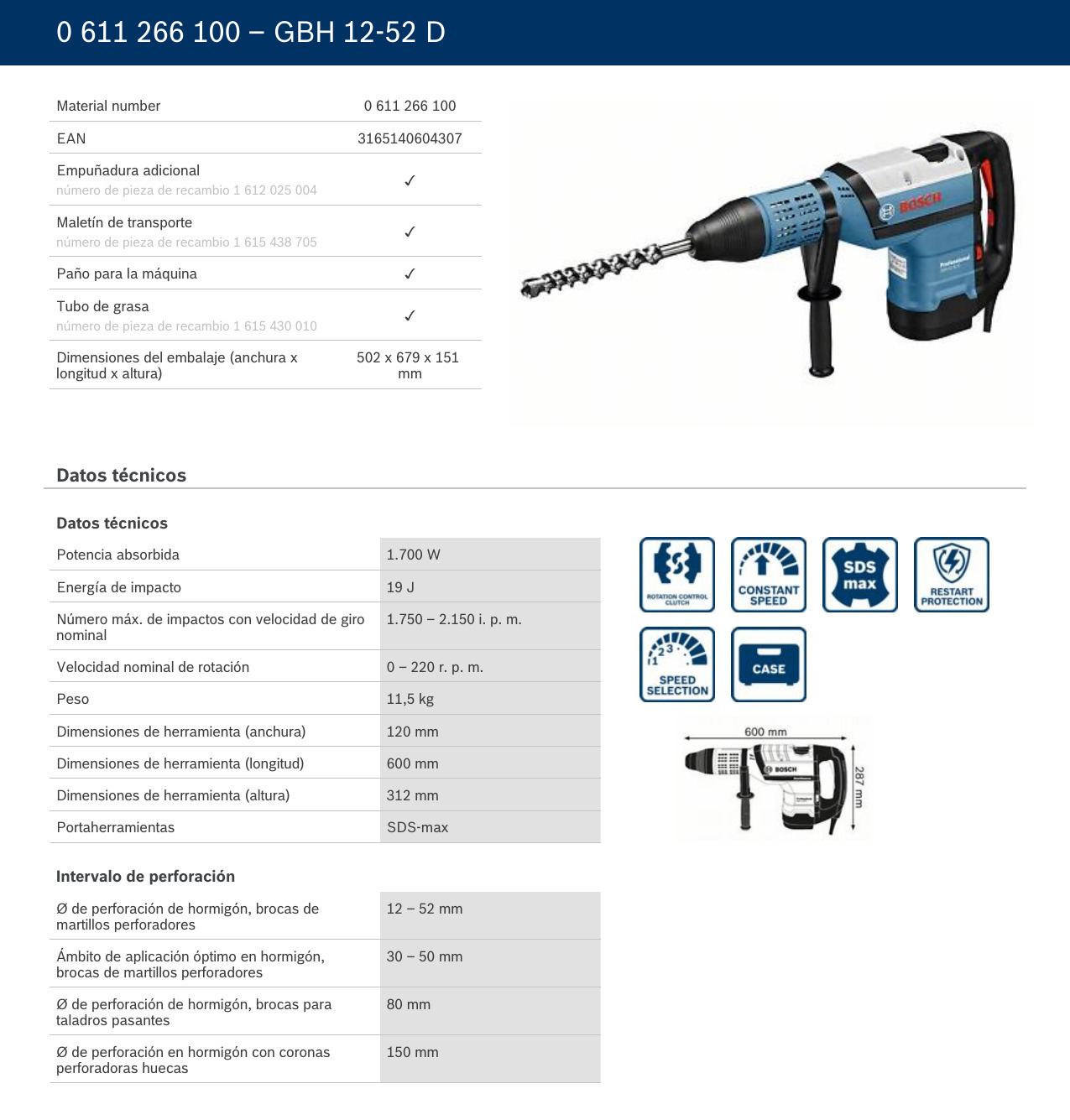 El martillo rotativo Bosch SDS Max más resistente del mercado, el GBH 12 52 D tiene un motor potente y de alta gama que ofrece 19J de energía de impacto para un cincelado pesado y un rendimiento máximo en todas las aplicaciones SDS Max. El usuario está protegido contra los peligros de atascos de accesorios gracias a un embrague de control giratorio que minimiza el par sin bloqueos bruscos en caso de sobrecarga o atascamiento. La protección de reinicio también garantiza que la máquina no pueda permanecer “encendida” en caso de un corte de energía o un enchufe desconectado, y no se iniciará por sí sola si se enchufa a una toma de corriente.