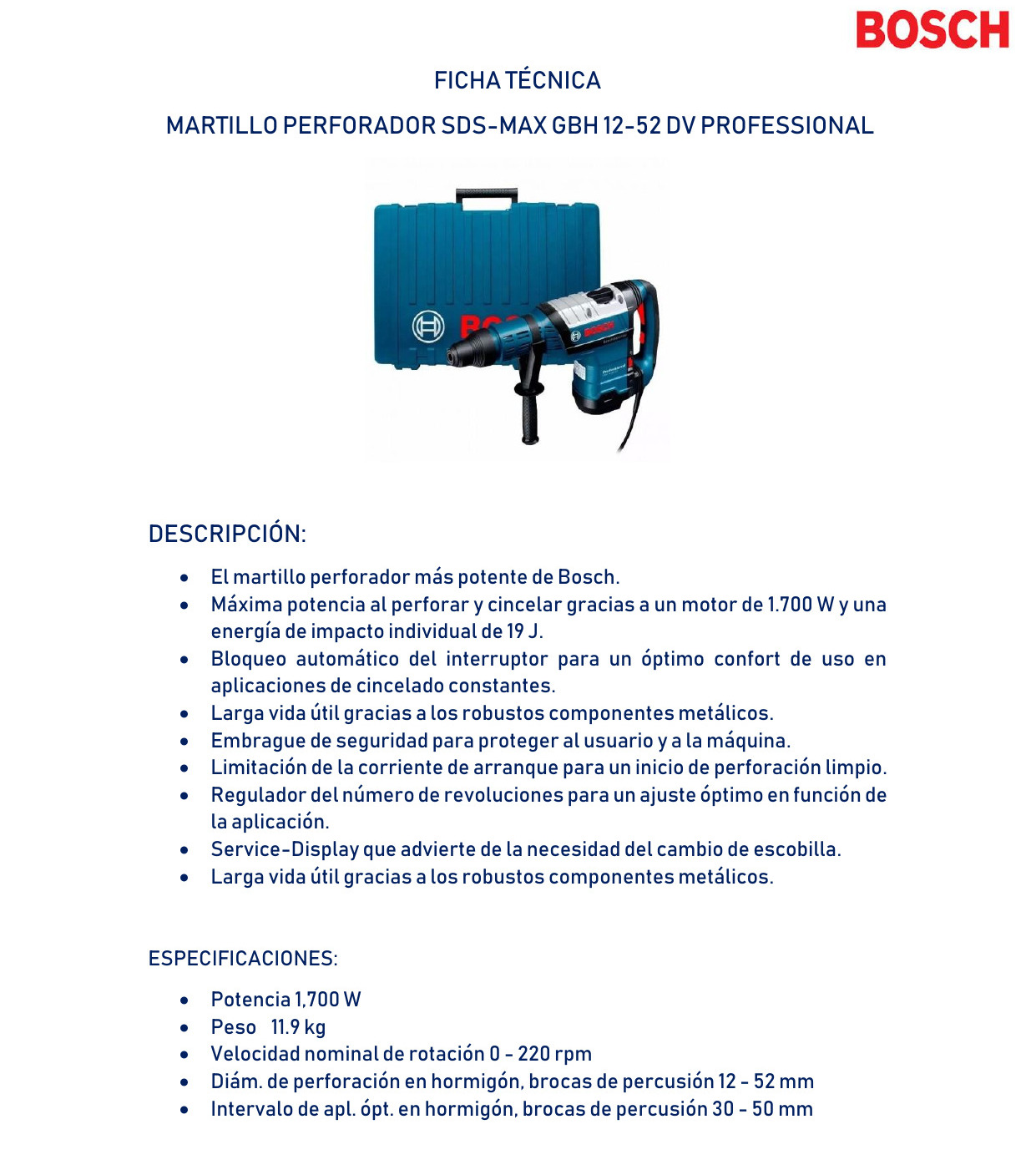 ROTOMARTILLO – > MARCA: BOSCH -> MODELO: SDS MAX GBH12-52DV ; realizamos entrega en las ciudades de Lima, Arequipa, Cusco , Moquegua , Tacna , Ica , Chiclayo , Trujillo, Cajamarca, Piura, Tumbes, iquitos, Huancayo , Ayacucho , Pucallpa, Huanuco , Cerro de Pasco ; llevamos mas de 10 años comercializando BOSCH en Peru , somos especialistas importando rotomartillo, herramientas electricas , martillos, martillo perforador Rotomartillo BOSCH SDS MAX GBH12-52DV