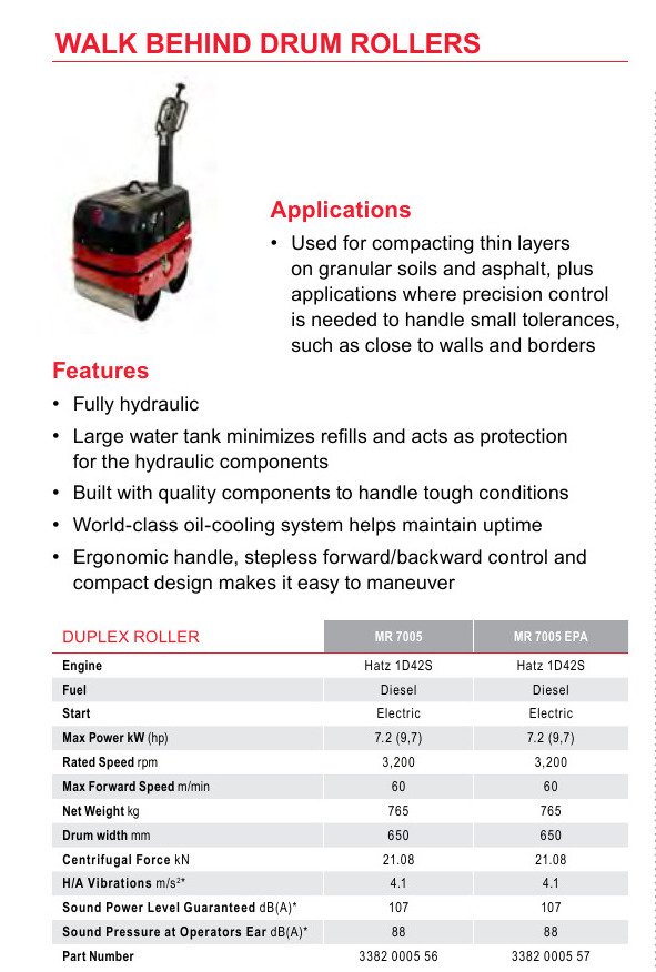El rodillo de doble tambor Chicago Pneumatic MR 7005 Walk-Behind está diseñado para condiciones difíciles. El funcionamiento hidráulico completo, así como un gran tanque de agua y un sistema de enfriamiento de aceite de clase mundial ayudan a garantizar una larga vida útil. Estas unidades son adecuadas para compactar capas delgadas de suelos granulares y asfalto. 1,687 libras (765 kg), 26 pulgadas (650 mm) de ancho del tambor.