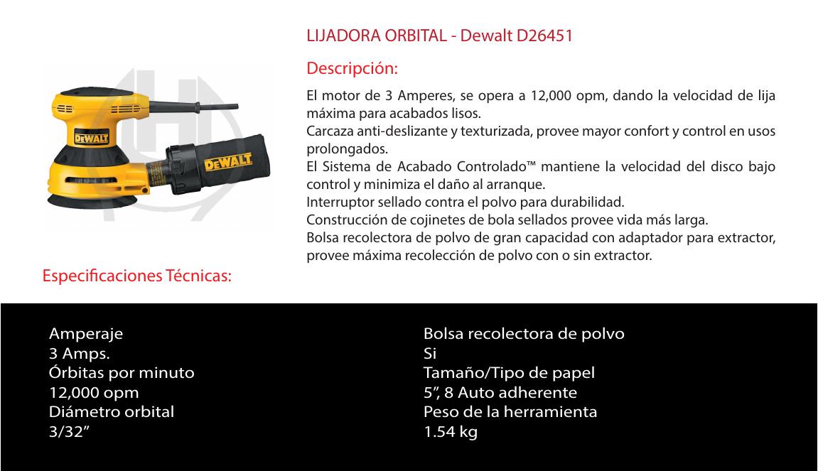 LIJADORA ORBITAL MARCA: DEWALT MODELO: D26451