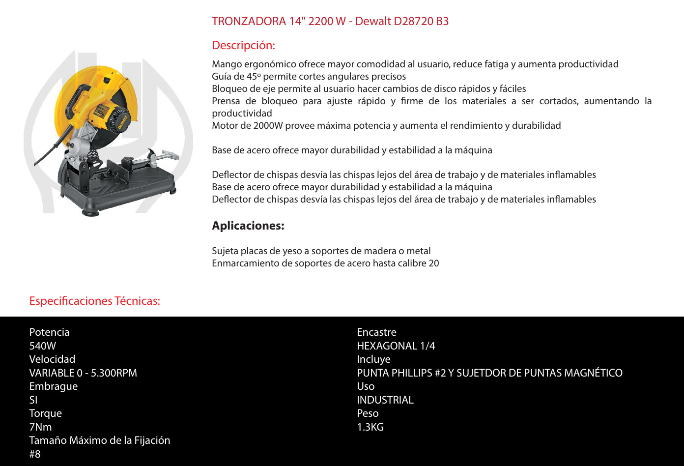 Esta potente Tronzadora de Metales DeWalt te proveera de una fuerza y manejo insuperables para los trabajos pesados. Esta poderosa herramienta es ideal para cortar en todo tipo de metales, tuberías, cañerías y acero inoxidable. Además, está preparado para soportar los más exigentes trabajos.