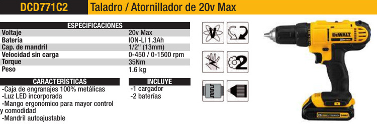 COMBO TALADROS – > MARCA: DEWALT -> MODELO: DCD771-C2 ; realizamos entrega en las ciudades de Lima, Arequipa, Cusco , Moquegua , Tacna , Ica , Chiclayo , Trujillo, Cajamarca, Piura, Tumbes, iquitos, Huancayo , Ayacucho , Pucallpa, Huanuco , Cerro de Pasco ; llevamos mas de 10 años comercializando DEWALT en Peru , somos especialistas importando combo taladros, herramientas electricas , taladros, taladro/atornillador Combo Taladro Atornillador Inalámbrico DCD771-C2 1/2pulg. + 2 Baterias + Cargador + Llavero + Tomatodo DEWALT