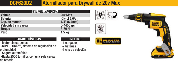 DESTORNILLADOR – > MARCA: DEWALT -> MODELO: DCF620 D2-B2 ; realizamos entrega en las ciudades de Lima, Arequipa, Cusco , Moquegua , Tacna , Ica , Chiclayo , Trujillo, Cajamarca, Piura, Tumbes, iquitos, Huancayo , Ayacucho , Pucallpa, Huanuco , Cerro de Pasco ; llevamos mas de 10 años comercializando DEWALT en Peru , somos especialistas importando destornillador , herramientas electricas , atornillador, destornillador profesional Atornillador de Drywall DCF620 D2-B2 + 2 baterías 20V + cargador DEWALT