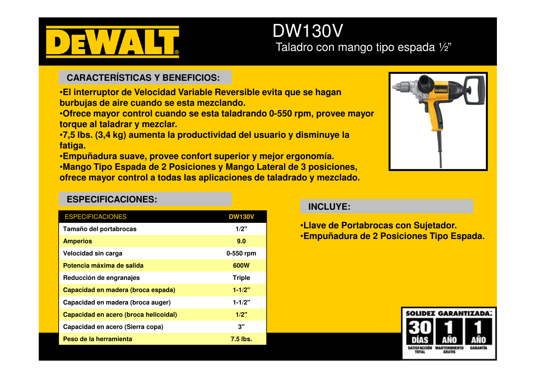 – Mango trasero tipo espada de dos posiciones y mango lateral de tres posiciones para mayor control en todas las aplicaciones de perforación y mezcla.