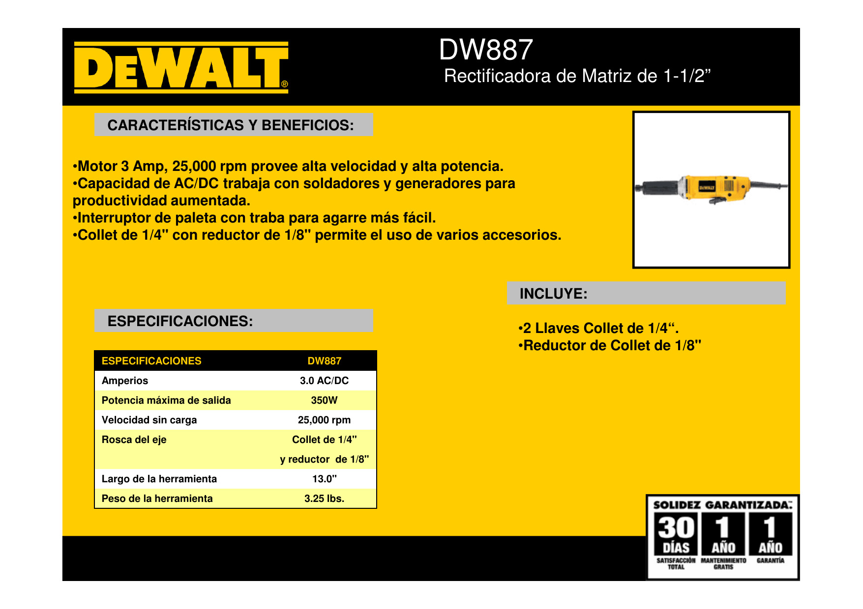 La amoladora de troquel DW887 de 1-1 / 2 “tiene un potente motor de 3 amperios para el rectificado de alta velocidad e incluye capacidad de CA / CC para trabajar con máquinas de soldar y generadores para aumentar la productividad y la versatilidad.