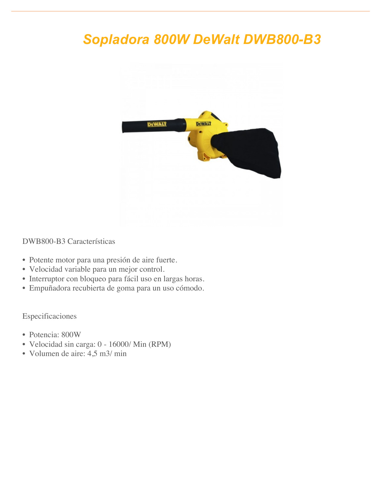 SOPLADOR DE AIRE – > MARCA: DEWALT -> MODELO: DWB800 ; realizamos entrega en las ciudades de Lima, Arequipa, Cusco , Moquegua , Tacna , Ica , Chiclayo , Trujillo, Cajamarca, Piura, Tumbes, iquitos, Huancayo , Ayacucho , Pucallpa, Huanuco , Cerro de Pasco ; llevamos mas de 10 años comercializando DEWALT en Peru , somos especialistas importando soplador de aire, equipo de jardineria , soplador de hojas, soplador de hojas electricaSoplador de Aire DEWALT DWB800