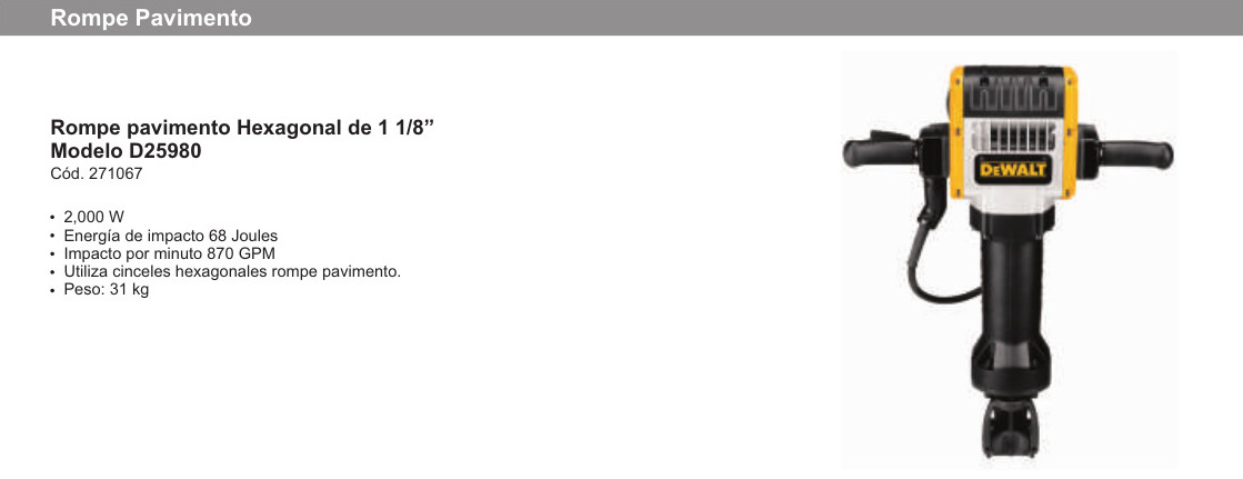 Martillo Rompe-Pavimento 2000 W 68 J Dewalt D25980. Permite demoler suelos de hormigón, pavimento y bases de hormigón. Sistema AVC, Anti vibración. Empuñadura flotante que absorbe el rebote. Modulo electrónico para una constante potencia. Incluye: Mangos lateriales con sistema antivibración.