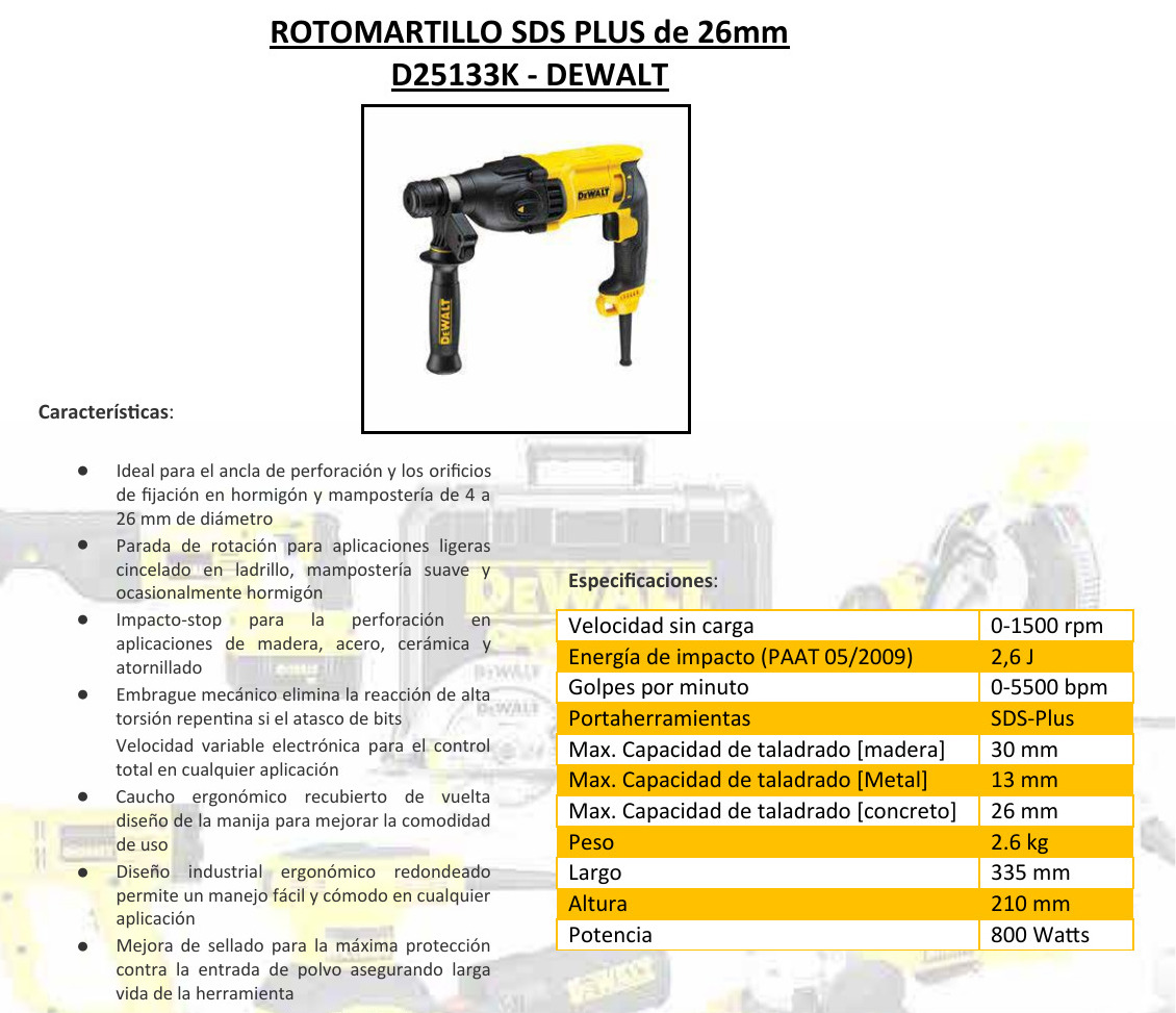 ROTOMARTILLO – > MARCA: DEWALT -> MODELO: SDS PLUS D25133K ; realizamos entrega en las ciudades de Lima, Arequipa, Cusco , Moquegua , Tacna , Ica , Chiclayo , Trujillo, Cajamarca, Piura, Tumbes, iquitos, Huancayo , Ayacucho , Pucallpa, Huanuco , Cerro de Pasco ; llevamos mas de 10 años comercializando DEWALT en Peru , somos especialistas importando rotomartillo, herramientas electricas , martillos, martillo electricoRotomartillo DEWALT SDS PLUS D25133K