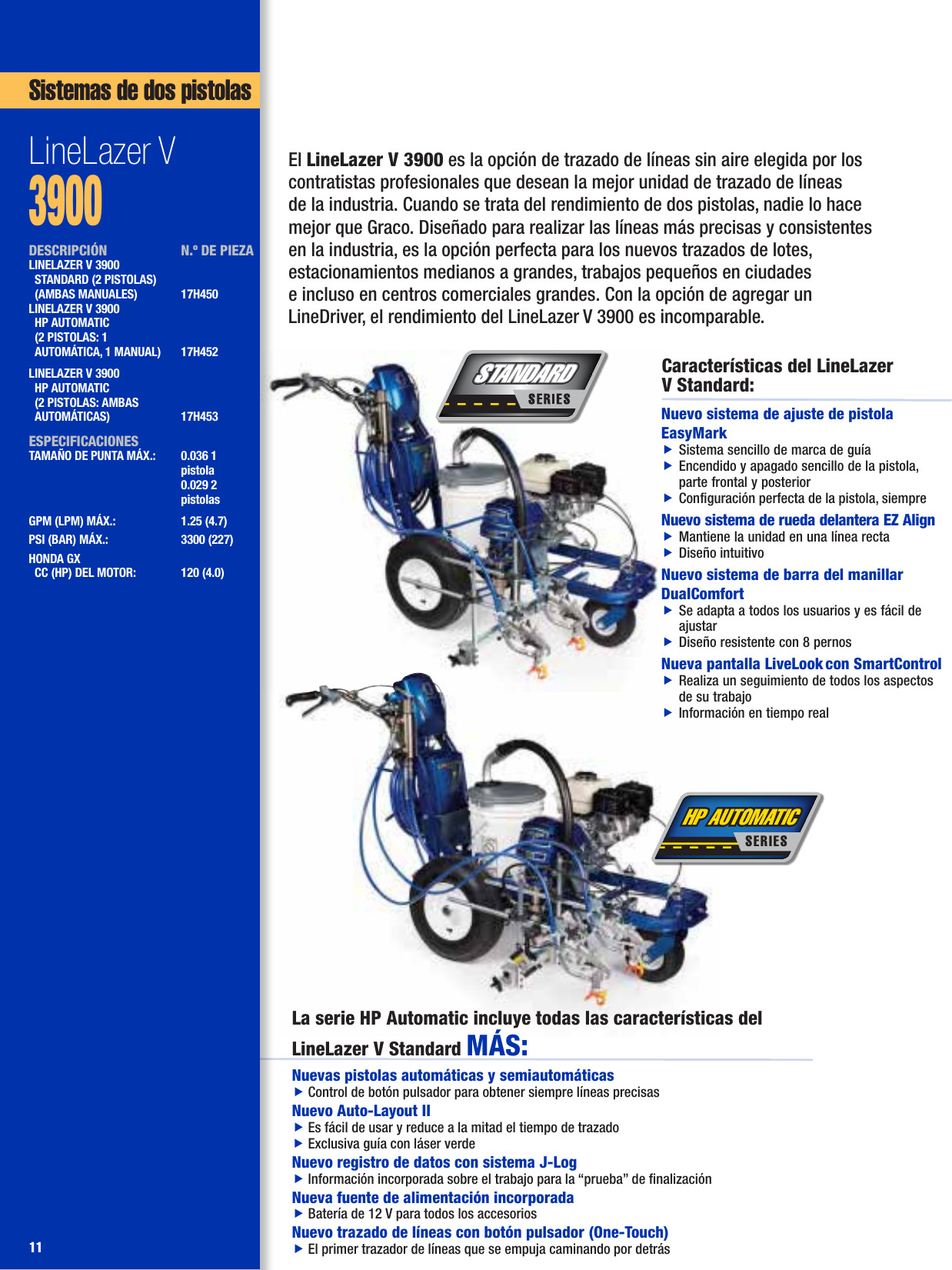 El LineLazer V 3900 es la opción de trazado de líneas sin aire para los contratistas de trazado profesionales que desean la mejor unidad de la industria. Cuando sea el momento para la realización de trabajos con dos pistolas, nadie lo hace mejor que Graco. Diseñado para ofrecer las líneas más precisas y uniformes en la industria, es la elección perfecta para la nueva disposición de lotes, estacionamientos medianos y grandes, trabajos urbanos pequeños e incluso grandes centros comerciales. Con la opción de añadir un LineDriver, el rendimiento del LineLazer V 3900 es inigualable.