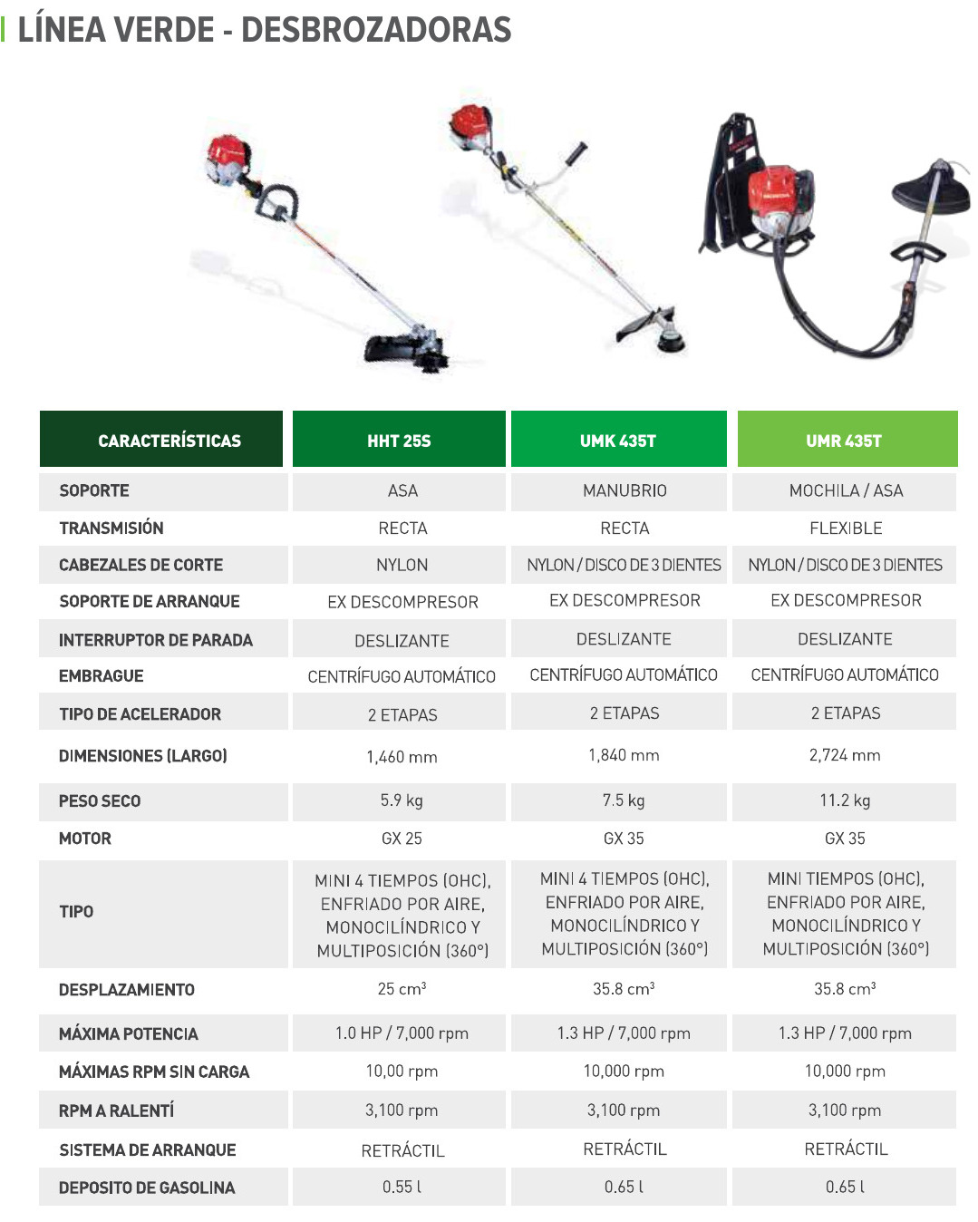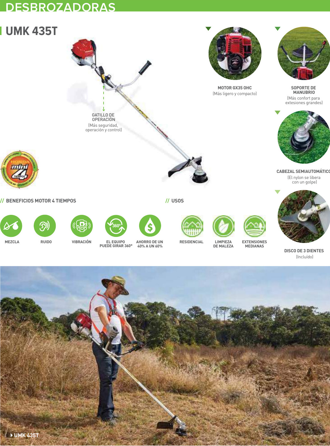 Motoguadaña con motor 4 tiempos GX35 de 1.6 HP de potencia máxima y eje recto. Ideal para cultivar y desmalezar en cualquier zona del país con eficiencia en el consumo de combustible.