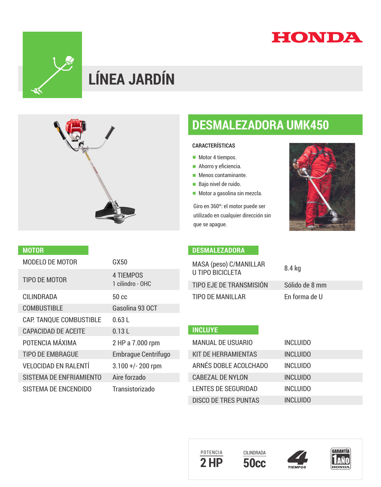 Motor : GX50 – OHC – 4 TIEMPOS No Usa Mezcla