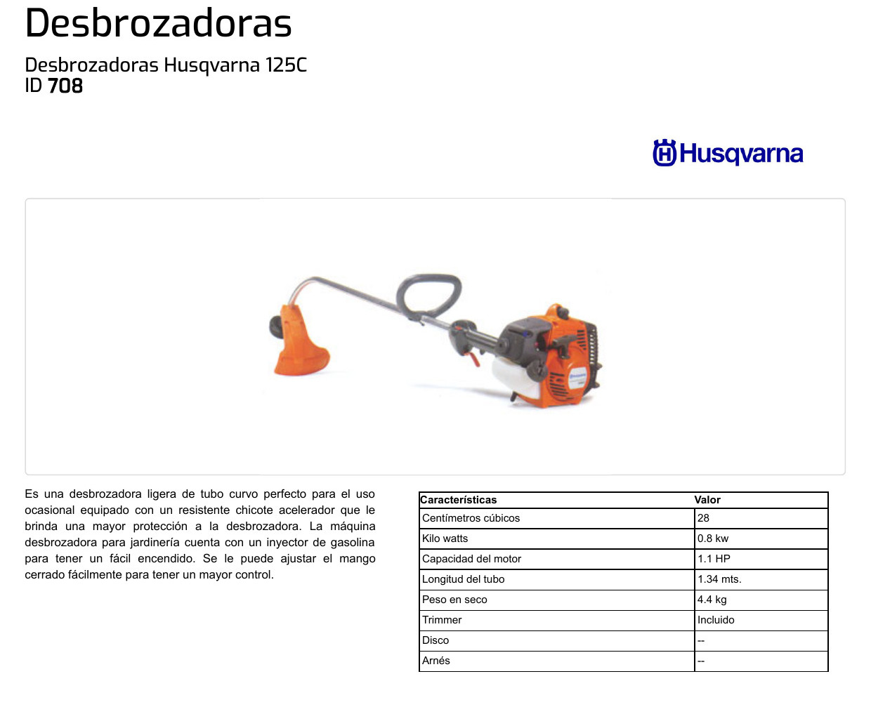 MOTOGUADAÑA – > MARCA: HUSQVARNA -> MODELO: 125C ; realizamos entrega en las ciudades de Lima, Arequipa, Cusco , Moquegua , Tacna , Ica , Chiclayo , Trujillo, Cajamarca, Piura, Tumbes, iquitos, Huancayo , Ayacucho , Pucallpa, Huanuco , Cerro de Pasco ; llevamos mas de 10 años comercializando HUSQVARNA en Peru , somos especialistas importando motoguadaña, equipo de jardineria , desbrozadora, desmalezadoraMotoguadaña HUSQVARNA 125C