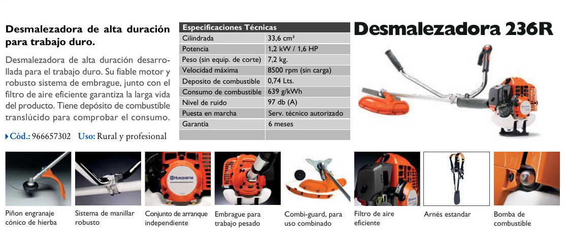 Husqvarna 236R es una desbrozadora de alta duración desarrollada para el trabajo duro. El motor X-Torq ® proporciona potencia y excelente ahorro de combustible, y un eficiente filtro de aire que alargan la vida del producto. Entregado con cabezal trimmy, cuchilla de puntas y arnés stándar.