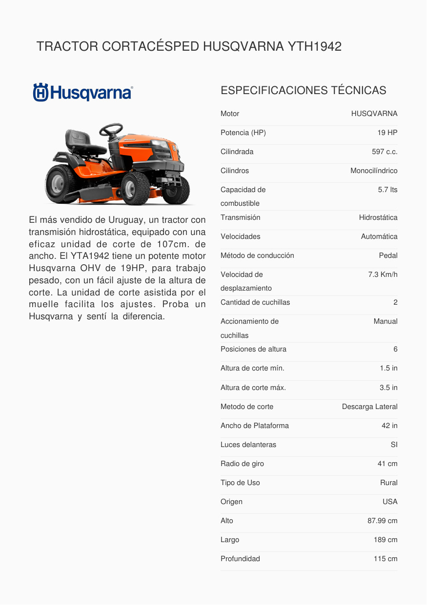 TRACTOR PARA CESPED – > MARCA: HUSQVARNA -> MODELO: YTH1942 ; realizamos entrega en las ciudades de Lima, Arequipa, Cusco , Moquegua , Tacna , Ica , Chiclayo , Trujillo, Cajamarca, Piura, Tumbes, iquitos, Huancayo , Ayacucho , Pucallpa, Huanuco , Cerro de Pasco ; llevamos mas de 10 años comercializando HUSQVARNA en Peru , somos especialistas importando tractor para cesped, equipo de jardineria , tractor, tractor corta grassTractor para césped HUSQVARNA YTH1942