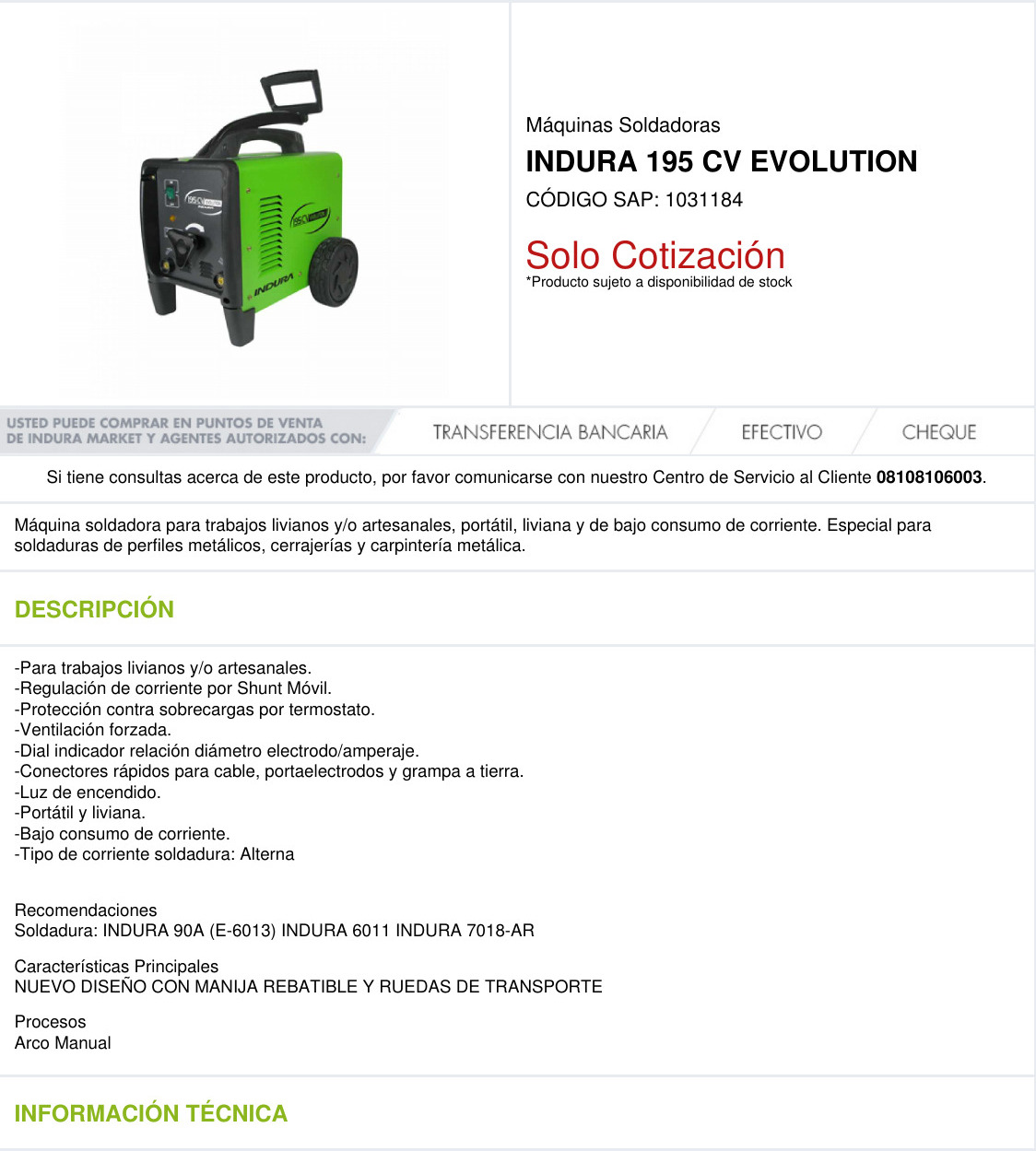 Somos Importadores Directos de INDURA 195 CV Evolution en Peru