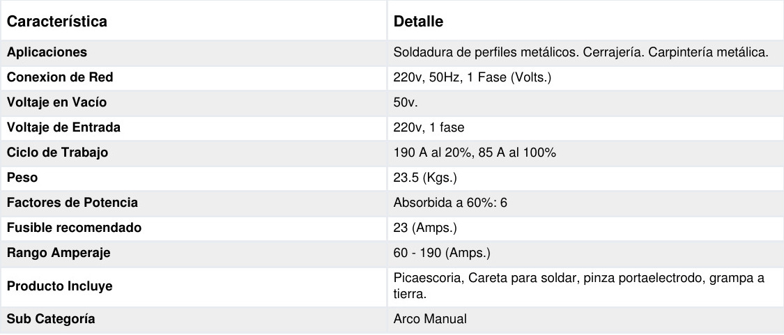 Soldadora estática 195 Amperios AC con conexión a red de 110-220V monofásico. Protegida con termostato por sobrecalentamiento y sistema regulación de amperaje por stunt móvil. Portátil y liviana, con rango de amperaje de 60 a 190. Acople rápido para porta electrodo y grampa de tierra.