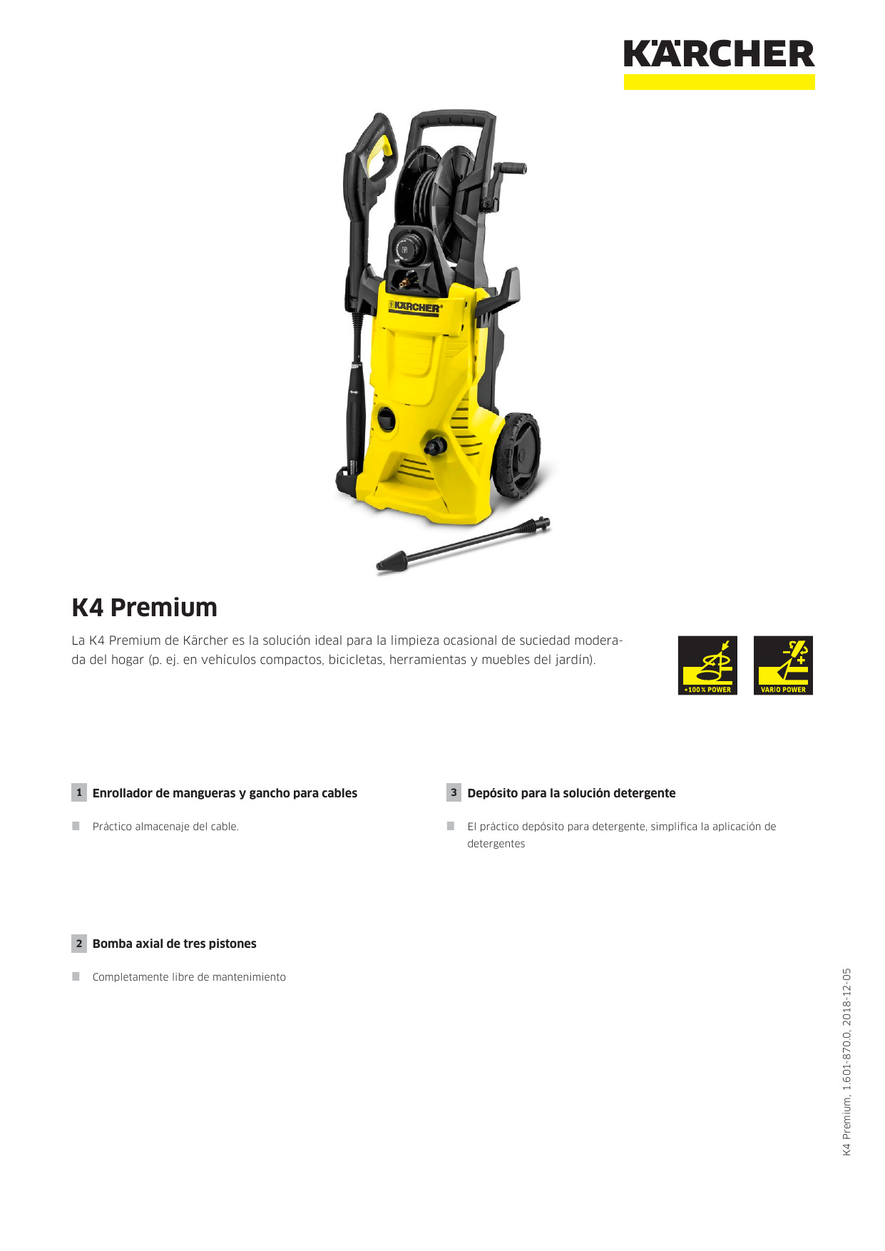 La K4 Premium de Kärcher ofrece un alto desempeño y brinda un excepcional tiempo de servicio. La hidrolavadora está diseñada para una limpieza ocasional de suciedad moderada. Es ideal para la limpieza de vehículos muebles de jardín, bicicletas, etc., gracias a la lanza Vario Power y a la boquilla rotativa. La presión con la que sale el agua puede ajustarse a las necesidades de limpieza con un simple giro en la lanza. Y la boquilla rotativa ofrece un excelente resultado de limpieza al usarse sobre superficies resistentes que contengan suciedad fuertemente adherida. El filtro interno de agua protege a la bomba de alta presión contra las impurezas que tiene el agua, prolongando la vída útil de la bomba de alta presión.