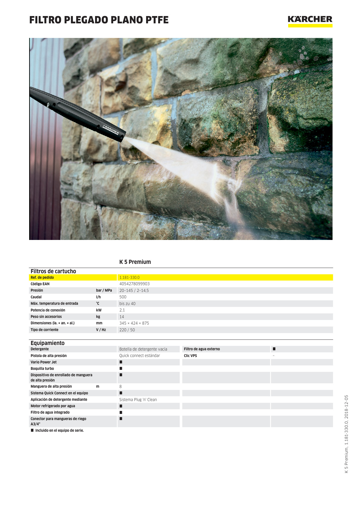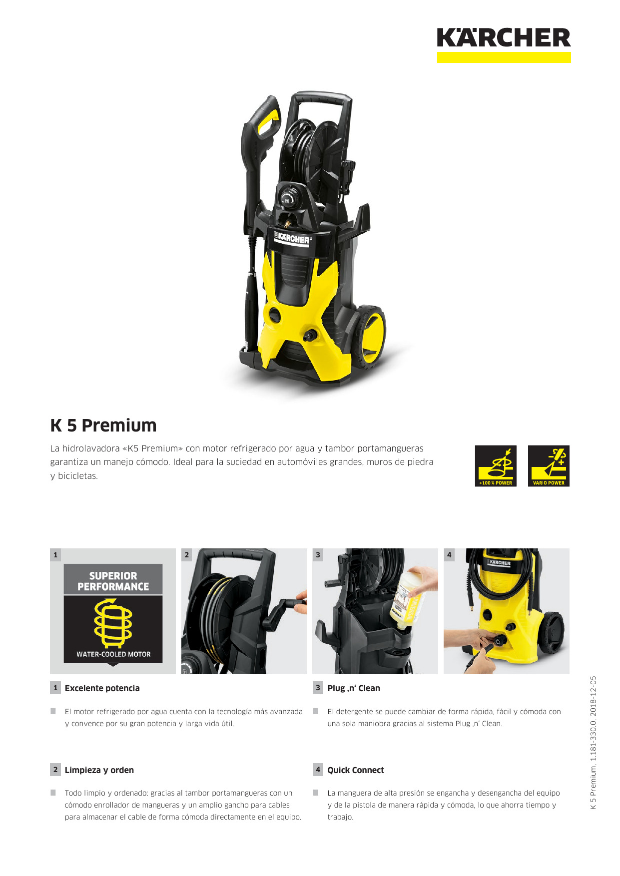 Para aplicaciones ocasionales y suciedades de medias a incrustadas, se recomienda la limpiadora de alta presión K5 Premium con potente motor refrigerado por agua. Elimina en un santiamén la suciedad de coches grandes, muros de piedra y bicicletas. Los detalles de equipamiento incluyen una pistola con práctica conexión rápida Quick Connect, manguera de alta presión de 8 m para un radio de acción amplio, un tubo pulverizador Vario Power (VPS) para un ajuste de la presión según las necesidades y una limpieza suave de las superficies, una boquilla turbo con chorro giratorio muy eficaz, así como un filtro de agua que protege la bomba contra el ensuciamiento de forma fiable. El paquete se completa con el limpiador universal P&C de Kärcher.
