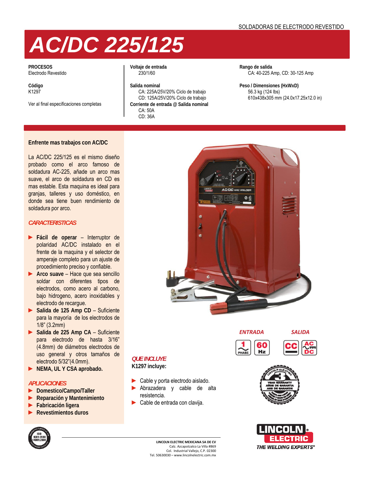 Rango de salida (amperios) : CA: 40-225, CC: 30-125