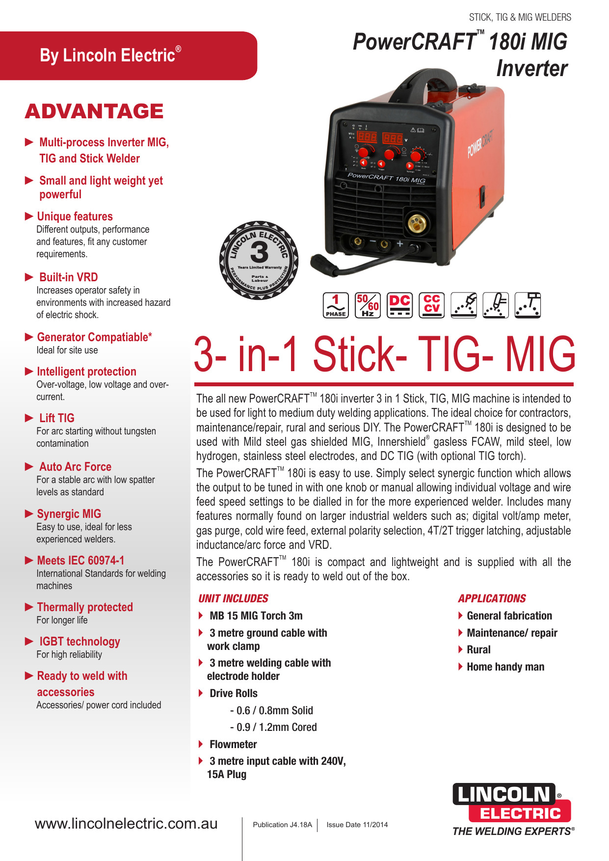 El PowerCRAFTTM 180i está diseñado para usarse con MIG de acero dulce protegido con gas, FCAW sin gas Innershield ®, electrodos de acero suave, bajo hidrógeno, acero inoxidable y DC TIG (con antorcha TIG opcional).