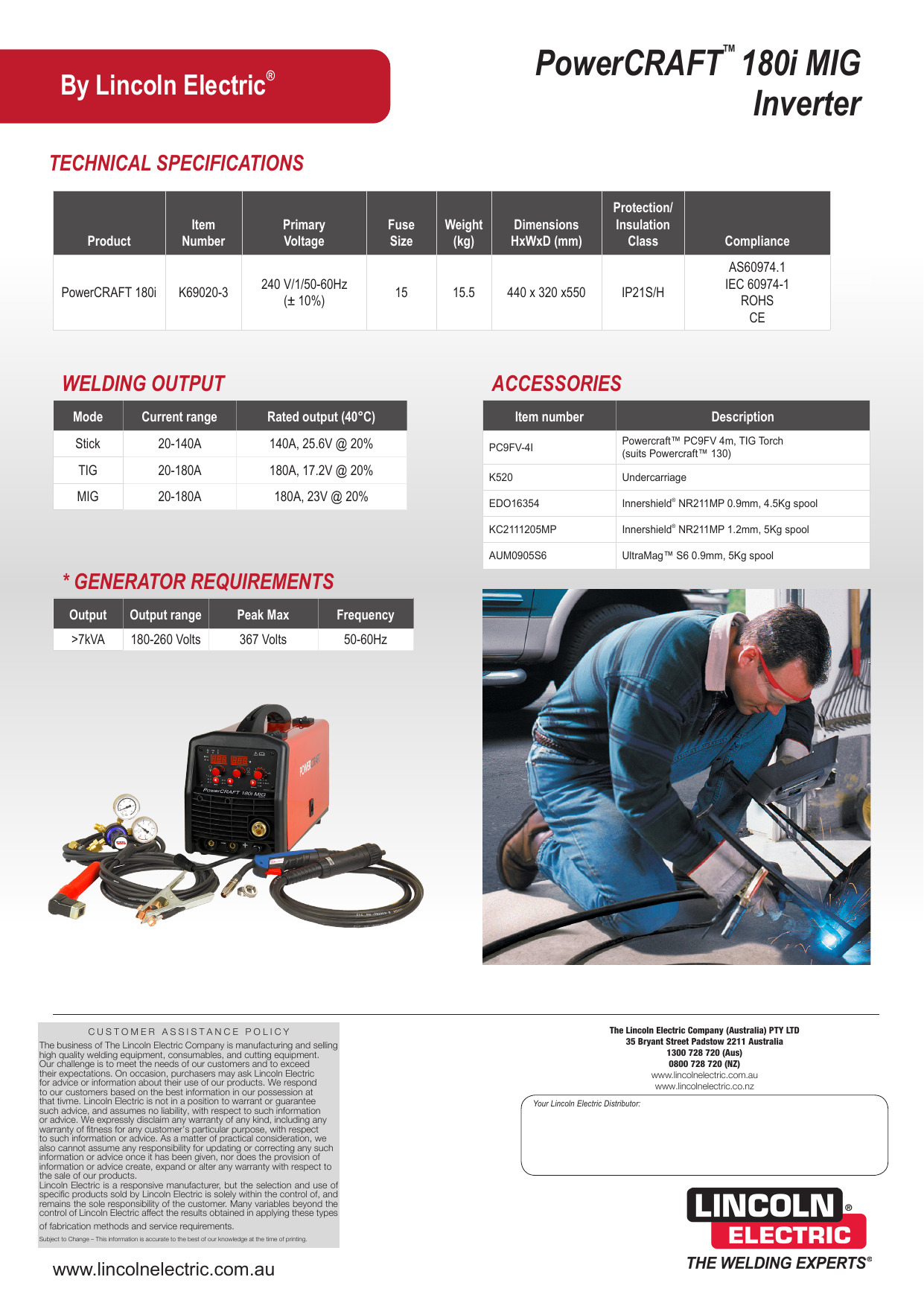El PowerCRAFT TM 180i es compacto y liviano y se suministra con todos los accesorios para que esté listo para soldar de la caja.