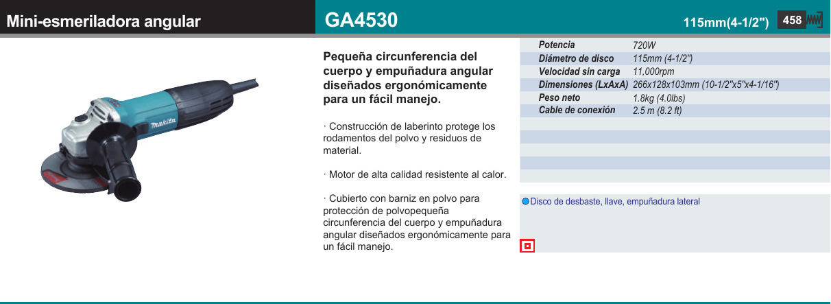 La Esmeriladora Angular de 4-1/2″ (modelo GA4530) de Makita combina una potencia de 6.0 amperes con la protección y comodidad de un motor con desempeño industrial de gran duración para esmerilado. La GA4530 es ideal para albañiles, soldadores, obreros de embarcaciones, técnicos automotrices, trabajos de piedra/azulejo, aire acondicionado, electricistas y contratistas en general para un rango de aplicaciones de esmerilado.