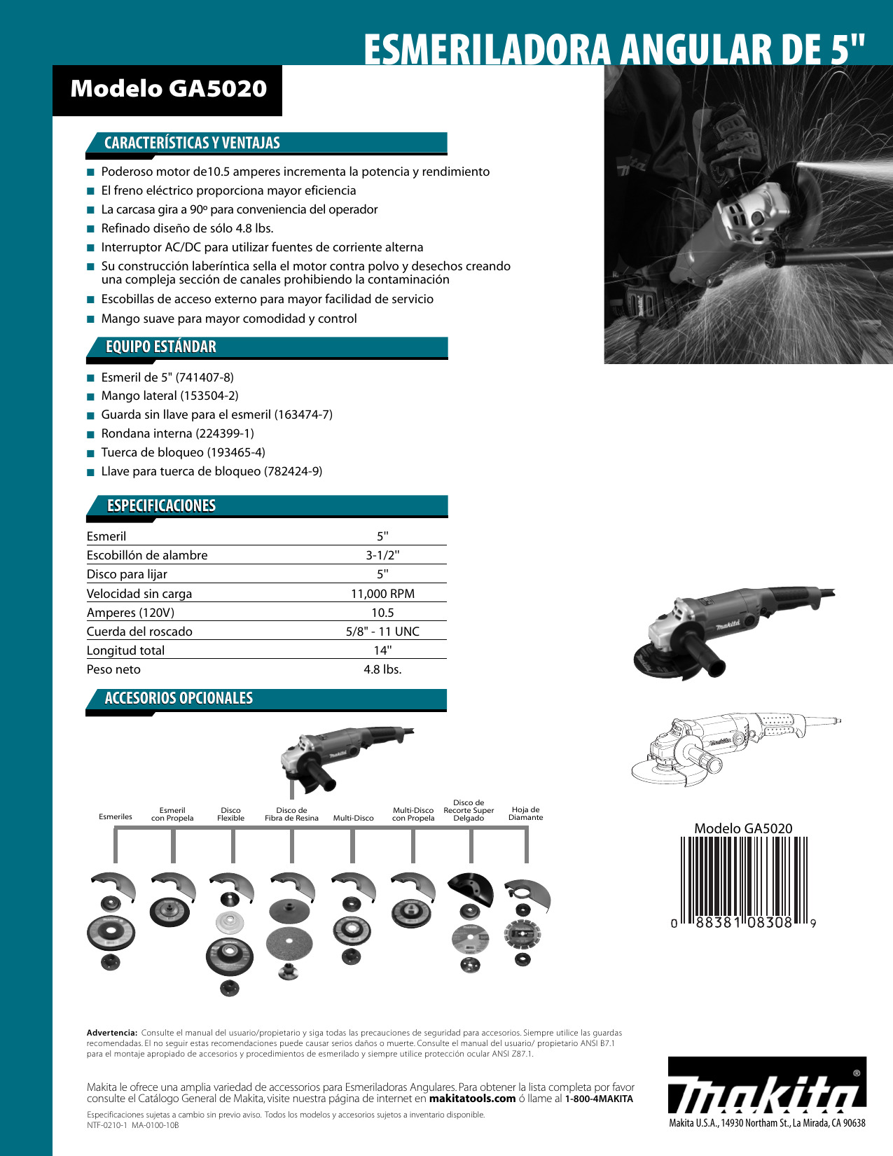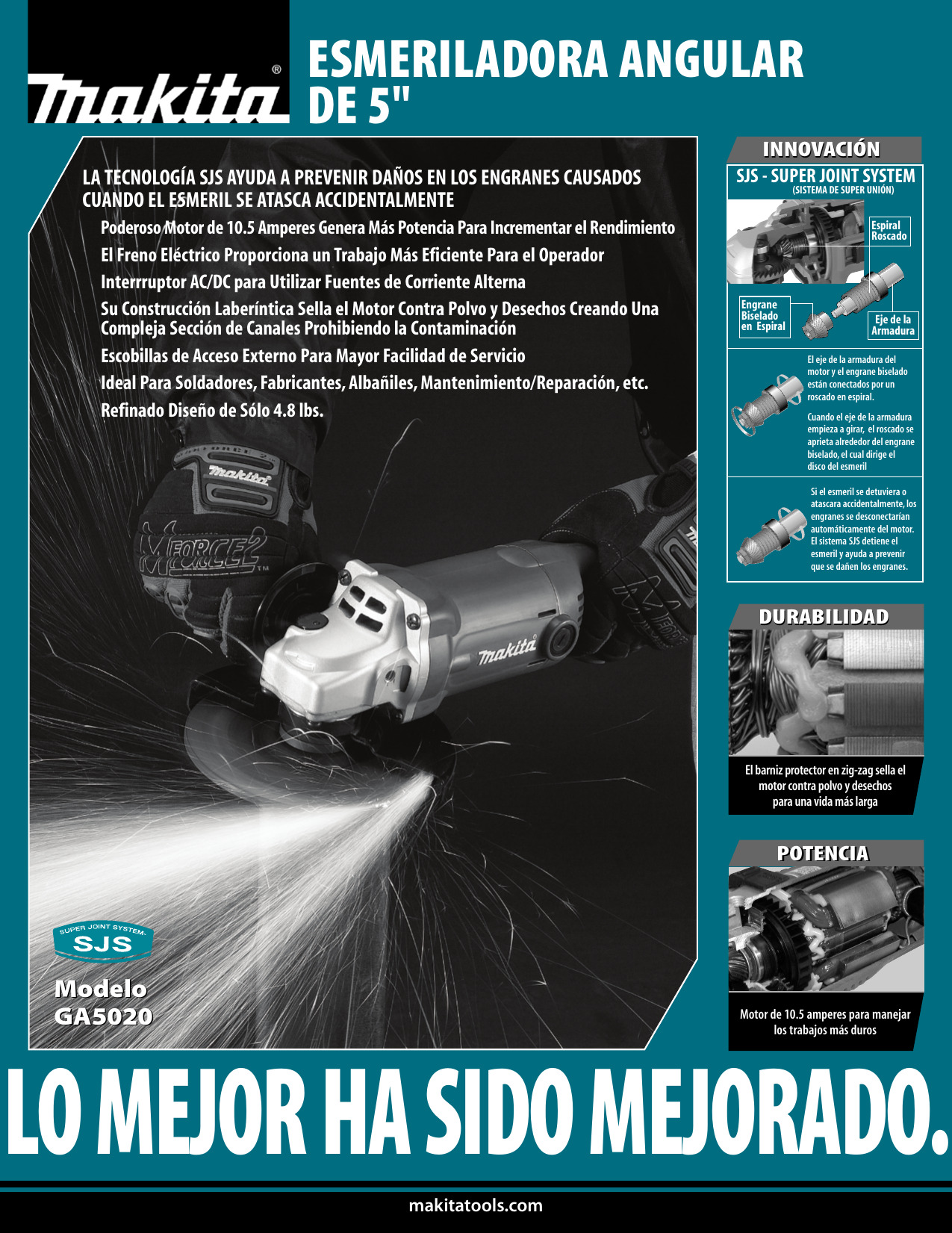 La GA5020 tiene la potencia de un motor de de 10.5 amperes que produce 11,000 RPM, con freno eléctrico para máxima productividad. Su construcción laberíntica sella y protege el motor y baleros contra polvo y residuos para una mayor duración. Además, el motor está sellado con un barniz protector en zig-zag el cual previene la contaminación que crea una barrera bajo rotación. La GA5020 está diseñada con SJS, una innovación de Makita que protege los engranes liberando automáticamente el motor si el esmeril se llegara a atascar o atorar.