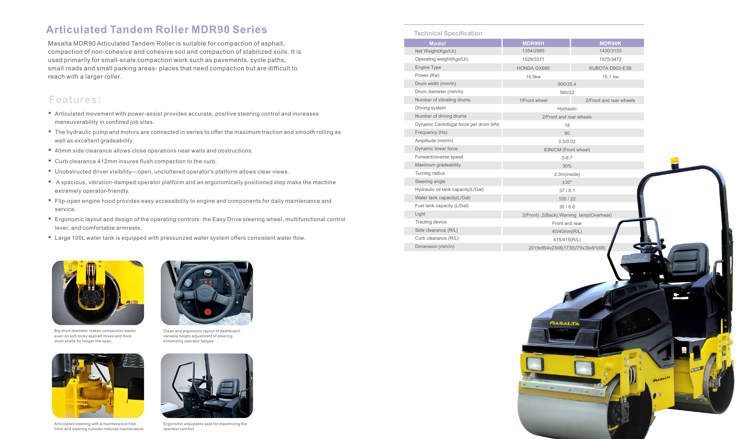 El Rodillo compactador tándem articulado es ideal para la compactación de asfalto, suelo estabilizado y suelo cohesivo o no cohesivo. Se emplea principalmente en la construcción de calzadas, rutas, calles, bici sendas, estacionamientos pequeños y otros lugares donde se requieran compactadoras de pequeña escala.