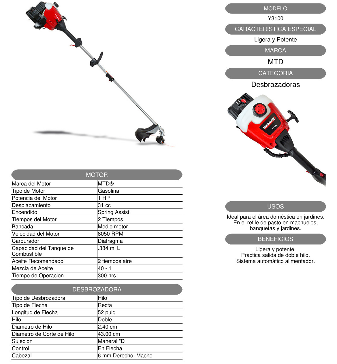 MOTOGUADAÑA – > MARCA: MTD -> MODELO: Y3100 ; realizamos entrega en las ciudades de Lima, Arequipa, Cusco , Moquegua , Tacna , Ica , Chiclayo , Trujillo, Cajamarca, Piura, Tumbes, iquitos, Huancayo , Ayacucho , Pucallpa, Huanuco , Cerro de Pasco ; llevamos mas de 10 años comercializando MTD en Peru , somos especialistas importando motoguadaña, equipo de jardineria , desbrozadora, desmalezadoraMotoguadaña MTD Yard Machines Y3100