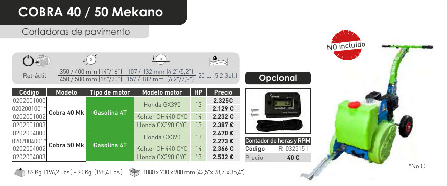 La COBRA 40 Mekano (que permite montar discos de 350 y 400 mm de diámetro) alcanza una profundidad de corte máximo de 132 mm, en tanto que la COBRA Mekano 50 (que permite montar discos de 450 y 500 mm de diámetro) alcanza una profundidad de corte de hasta 182 mm.