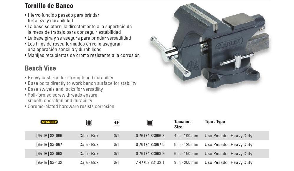 TORNILLO DE BANCO – > MARCA: STANLEY -> MODELO: 8PULG 83-132 ; realizamos entrega en las ciudades de Lima, Arequipa, Cusco , Moquegua , Tacna , Ica , Chiclayo , Trujillo, Cajamarca, Piura, Tumbes, iquitos, Huancayo , Ayacucho , Pucallpa, Huanuco , Cerro de Pasco ; llevamos mas de 10 años comercializando STANLEY en Peru , somos especialistas importando tornillo de banco , metalmecanica , tornillos, prensa de bancoTornillo de Banco 8 pulg STANLEY 83-132