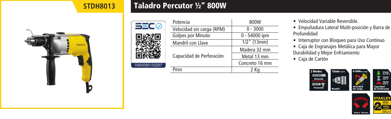 TALADRO PERCUTOR MARCA: STANLEY MODELO: STDH8013-B2
