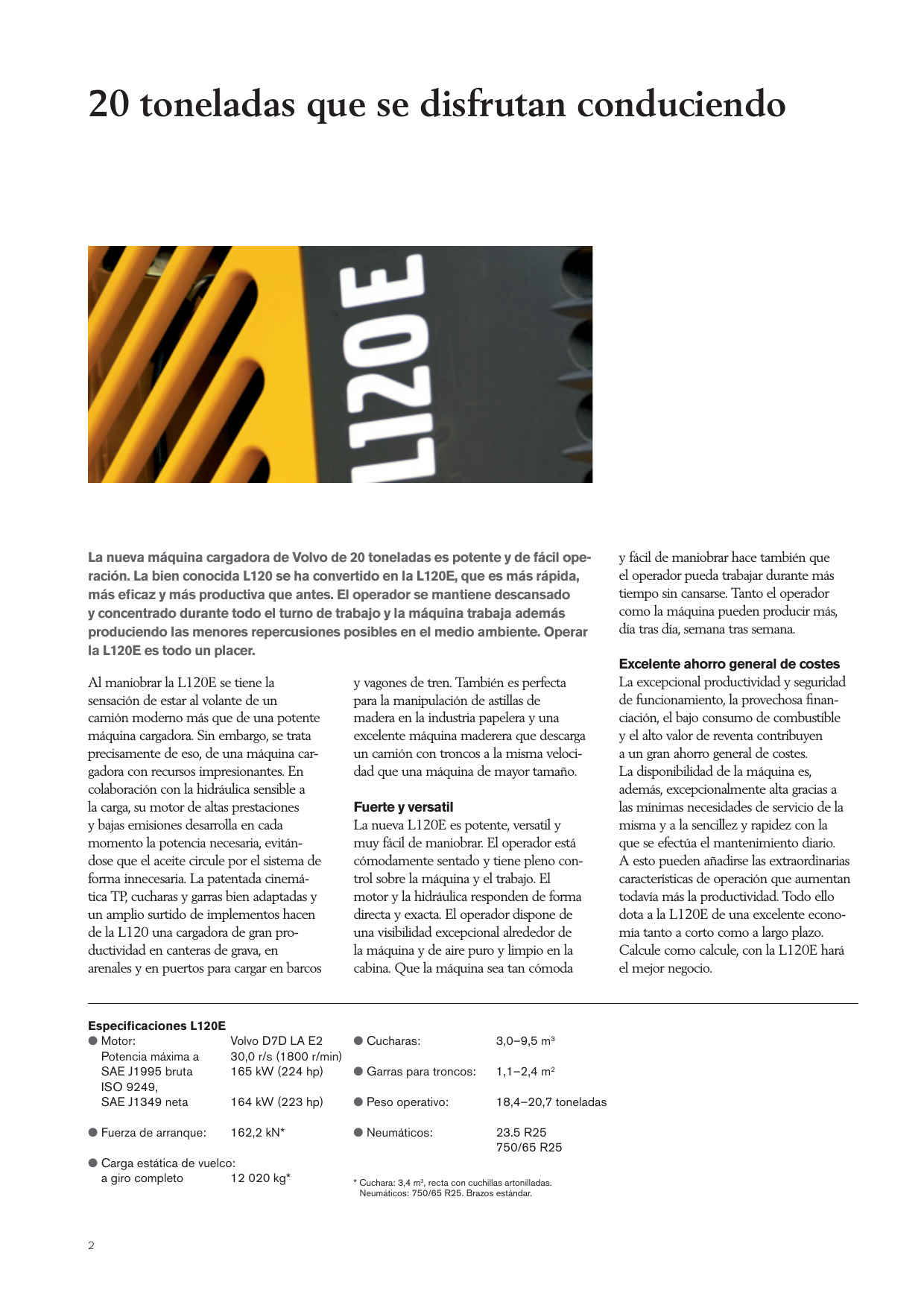 La nueva máquina cargadora de Volvo de 20 toneladas es potente y de fácil operación. La bien conocida L120 se ha convertido en la L120E, que es más rápida, más eficaz y más productiva que antes. El operador se mantiene descansado y concentrado durante todo el turno de trabajo y la máquina trabaja además produciendo las menores repercusiones posibles en el medio ambiente. Operar la L120E es todo un placer