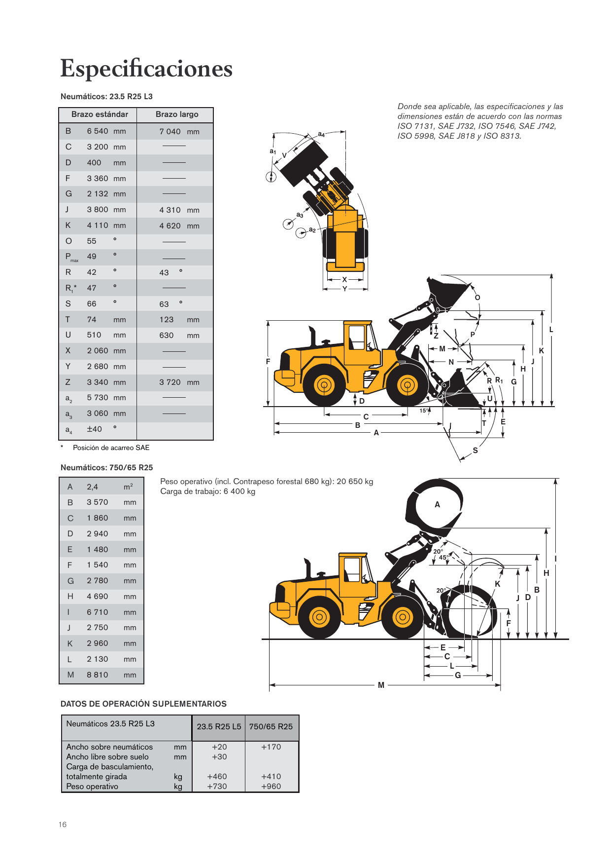* Cuchara: 3,4 m3, recta con cuchillas artonilladas. Neumáticos: 750/65 R25. Brazos estándar.